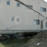 能登半島地震の液状化により傾いた住宅。最大沈下88mm。ダブルロック工法にて、木造2階建ての沈下修正工事を行いました。(現場:石川県羽咋市)