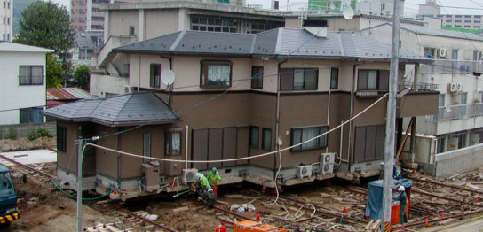 敷地外建物移動曳家工事。土地一帯のかさ上げ工事のため、2階建ての家を私道をまたい…